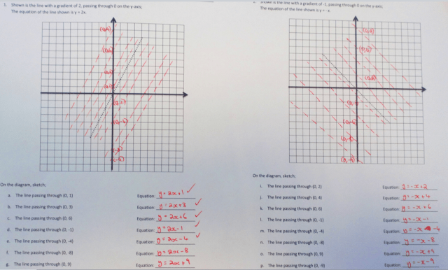 I could talk in length about my treatment of the whole topic of straight line; however, I have chosen to focus on a specific learning episode. To offer some context the class are familiar with the families of lines which are parallel with the axes. I have done very little work on tables of values, and will come back to this later. I previously would always start with this, however, I think that once learners have a feel for gradient and y-intercept we can look at patterns in the coordinates with a fresh perspective and tie the topic together. The class have worked on developing a conceptual understanding of gradient through a slow building up from the idea of vertical over horizontal, counting boxes “for every 1 box along, how many boxes up/down?”, finding gradients by “stepping out” before finally using the standard gradient formula. The idea of coming at this idea from various perspectives is so that pupils appreciate the affect the numerical value of gradient has, as opposed to simply being the result of some calculation.