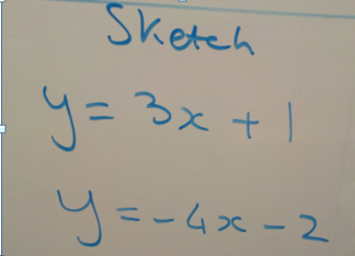 I asked what was happening. An interesting reply from several pupils was “the lines are moving sideways”. This response is notable as I’ve had pupils come out with this on previous occasions when I’ve been using dynamic software such as Desmos or Autograph. I wonder if I restricted the length of the lines that the vertical movement would be more obvious. It took more probing and specific questioning “what about where the line is crossing the y-axis?” before the idea of vertical movement became apparent.