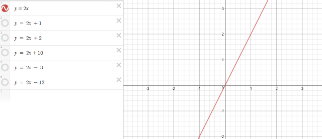 I used Desmos to illustrate each of the following lines. I think using the family of lines with gradient 2 draws more attention to the role of the coefficient of the x.