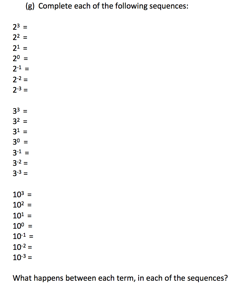 This task was inspired by the work of Tony Gardner. There is an assumption that pupils already know the law of indices for multiplication of terms and know the rule for power 0. Like all tasks, the pedagogy around the task will determine the extent of the mathematical activity. If issued as a worksheet to complete, without opportunities for conjecture, exploration and reflection then there may be less fruitful mathematical activity than if those opportunities were allowed for.