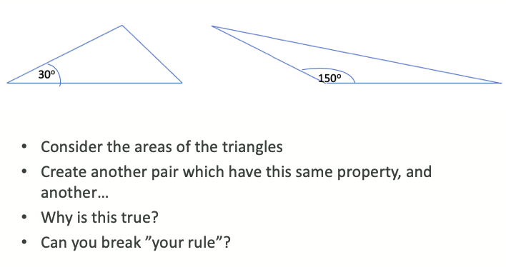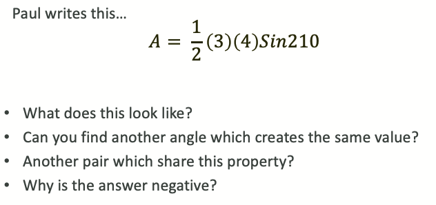 This task is designed to help pupils make connections between trig graphs (and the unit circle if taught this) and the application of trig in finding areas of triangles.