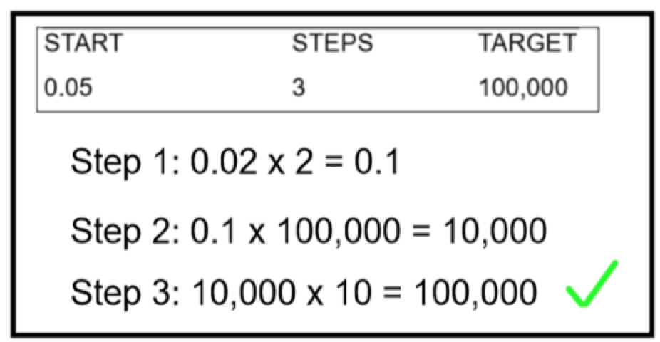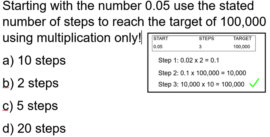 This could be extended in many different directions depending on the starting and target values. These could easily be set by the teacher or as I have done allow the pupils to select and in fact, I eventually had them create questions that their partner then had to solve which resulted in some tough questions. Quite quickly tweaks needed to be made like no multiplication by 1 but I wanted them to discover this “cheat”.  If the instructions potentially pose an issue, then you could set it up the way I have in the example but have them try to fill in the blanks for a few attempts?