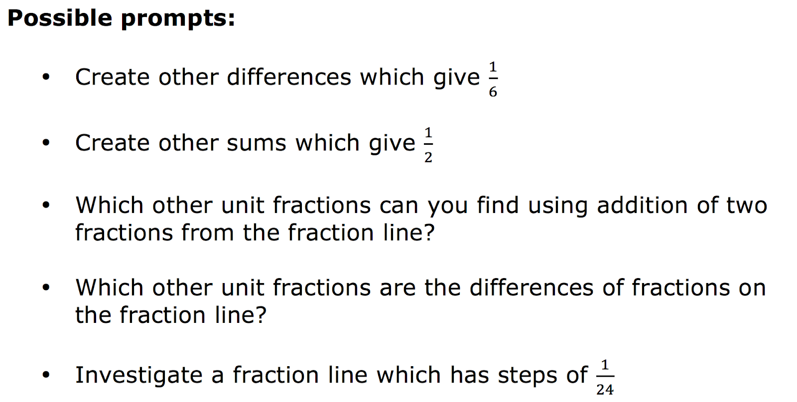 I don’t envisage this task as being a worksheet to be issued to classes. Rather as the focus of a class discussion and investigation into the nature of fractions. The task aims to link the number line representation with the procedures for adding and subtracting fractions. Further it is about building fluency in counting with fractions. All too often, I’ve found pupils aren’t adept at mental approaches to this and overly rely on procedures. I often write about developing “feel” for ideas. The results of this task may not be immediately obvious, however, the discernments I hope may arise would be around familiarity with the family of fractions which is related to the twelfths, including halves, quarters, thirds and sixths. Other possible extension is to extend the fraction line into improper fractions and or backwards into negative fractions.