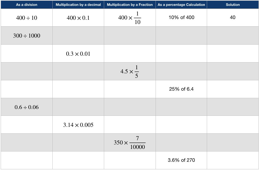 This task is designed is to help students reinforce connections between division and multiplicative representations in decimals, percentages and fractions. There is conversion between representations and some calculation practice.