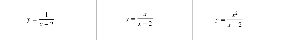 4. I anticipated that if the questions had thoughtlessly varied vertical asymptotes, then the complexity of it would be greatly reduced. It is easy to see vertical asymptotes and pupils would match using this. Instead, I chose to utilise some variation theory in the design of the task so that there were various rational functions with the same vertical asymptotes. Pupils would then have to focus on some other key features to refine their decisions.