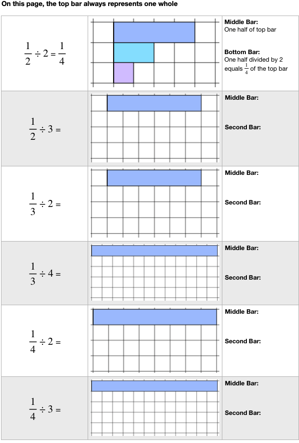 As I wrote this task, it occurred to me that division of fractions might be better taught using common denominators as it is some South East Asian countries. In setting up the questions, I had to define the whole as being the lcm of the denominators of the two fractions.