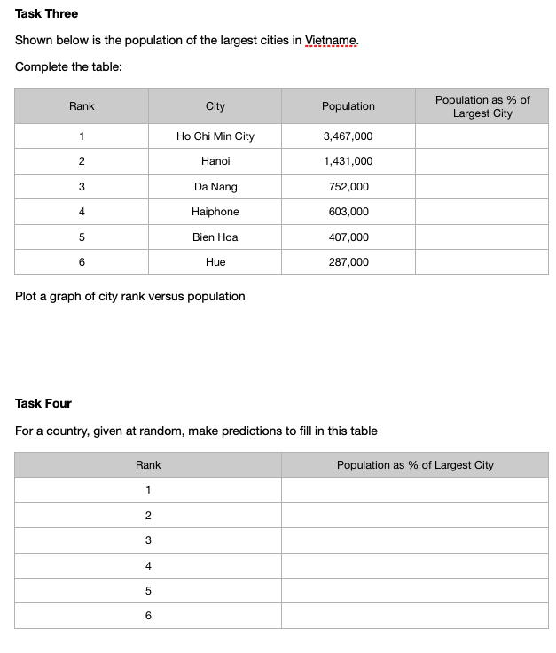 April 16, 2020June 25, 2020 Chris McGrane City Populations This task is a little different from normal. It’s about observing mathematical patterns in a real context. There is practice in this task on finding percentages and drawing graphs. The phenomena is illustrated for Germany, below. Download Here Credit: @chrismgrane84 Share this:Tweet Click to share on WhatsApp (Opens in new window) WhatsApp Click to email a link to a friend (Opens in new window) Email Click to print (Opens in new window) Print Like Loading... Related