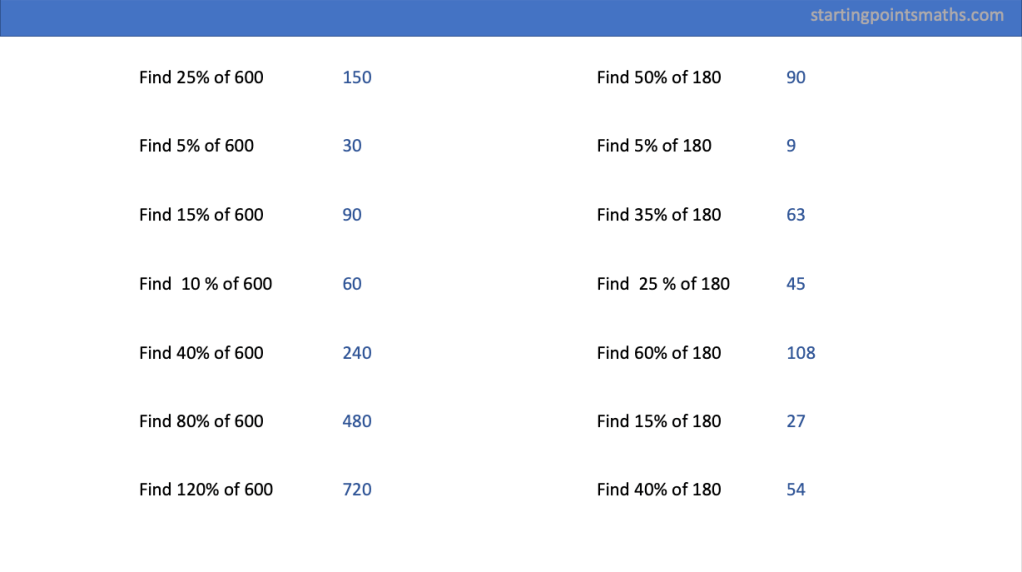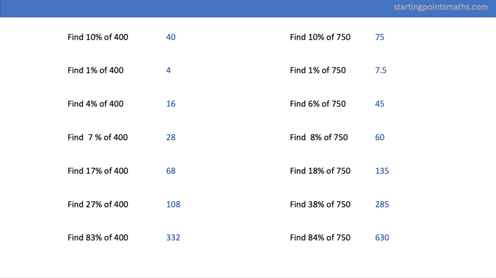 This series of percentage questions was designed for a class who had seen percentages many times, but were trying to “remember” how to find specific percentages. I wanted to draw attention to how it is possible to find any percentage using additive and multiplicative reasoning. Once pupils get the first question correct in each set, the others can be done by simply multiplying/dividing or adding up the previous answers in varying combinations.