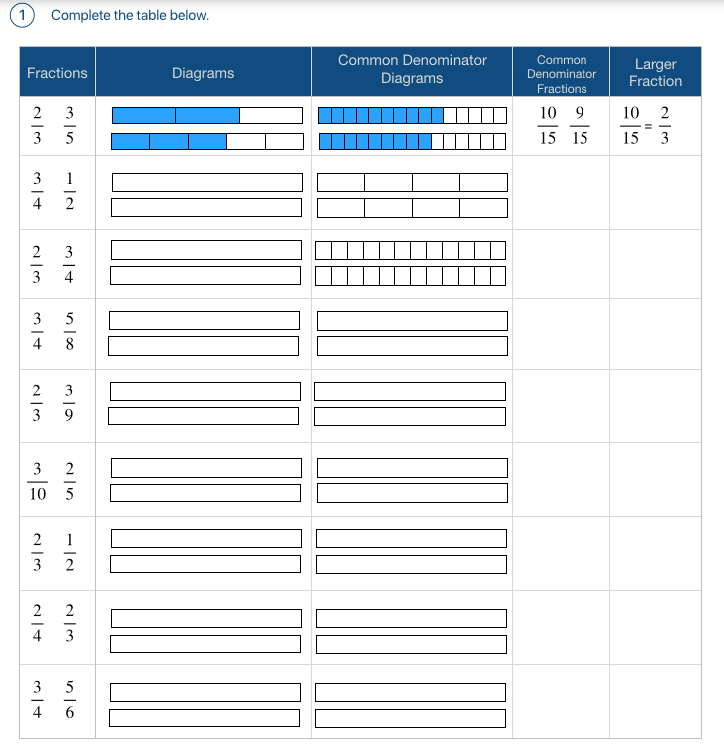 This task makes use of a bar model representation to draw attention to the requirement for finding common denominators to compare some fractions.