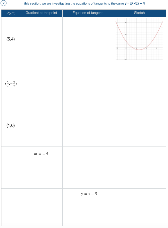 This year I find myself giving pupils less notes than ever before. I like to get them straight into the maths as soon as possible. We’ll discuss the first example and then kids will be off. I’ve ran many tasks like this with my Higher class this year. This task scaffolds the process of finding the equation of a tangent to a curve. However, it serves several other purposes: