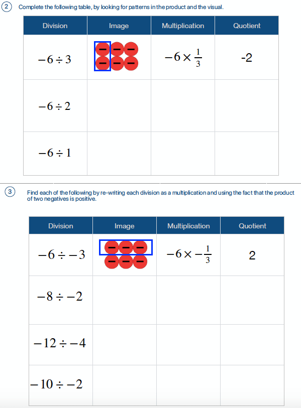 The first and second sections of the task are rooted in the idea of partitive division. That is, for example, “share -6 into 2 equal groups”. This metaphor is less easy for pupils to grasp in the third section, so I argue that measurement/quotative division makes more sense here. That is, for example, “how many groups of -3 are in -6”?.