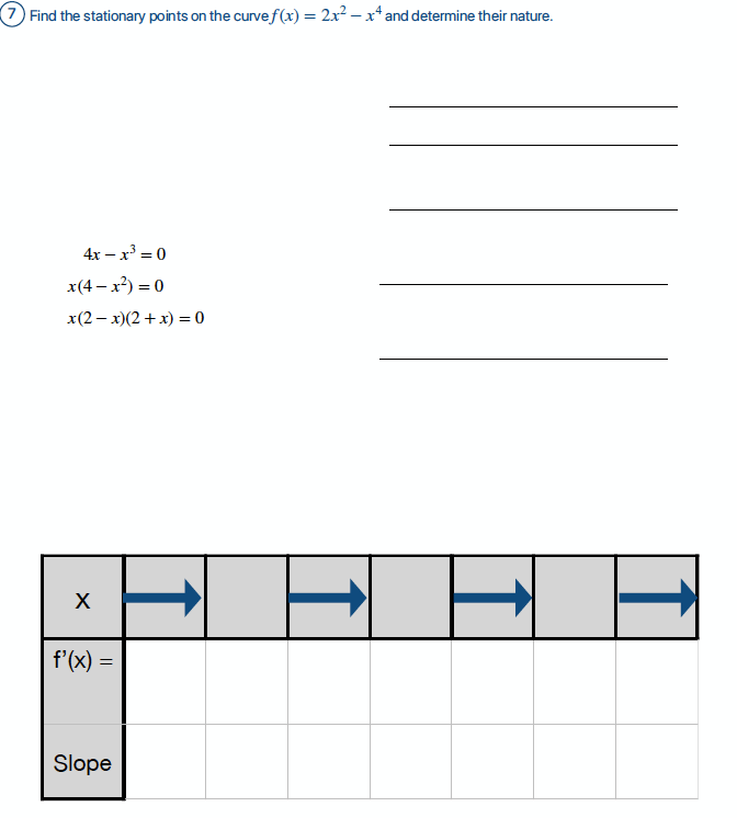 This task contains 8 examples of stationary points questions. They are scaffolded in order to increase the pace at which pupils get to practice the ideas. Some of the scaffolding might seem a bit random, but it is in places where I have found pupils struggle – factorising and solving quadratics. The trivial cases can sometimes cause more issues than the harder ones!