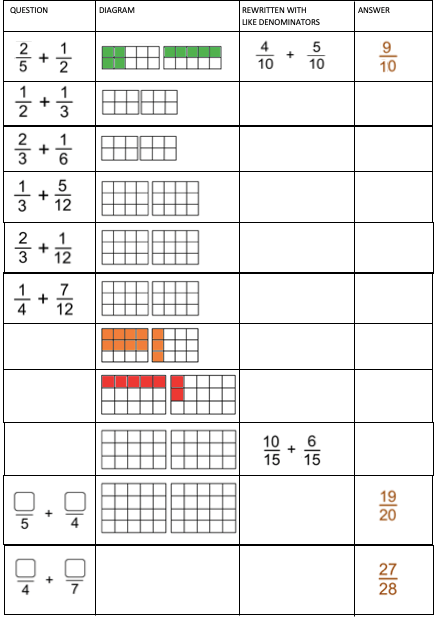 Some might question the purpose of the diagram. It’s not about pupils using this to find the lcm. It’s about a visual reinforcement to guard against misconceptions. Pupils often, naively, add the denominators and numerators. The inclusion of the diagram serves to provide a mental image to fall back upon.