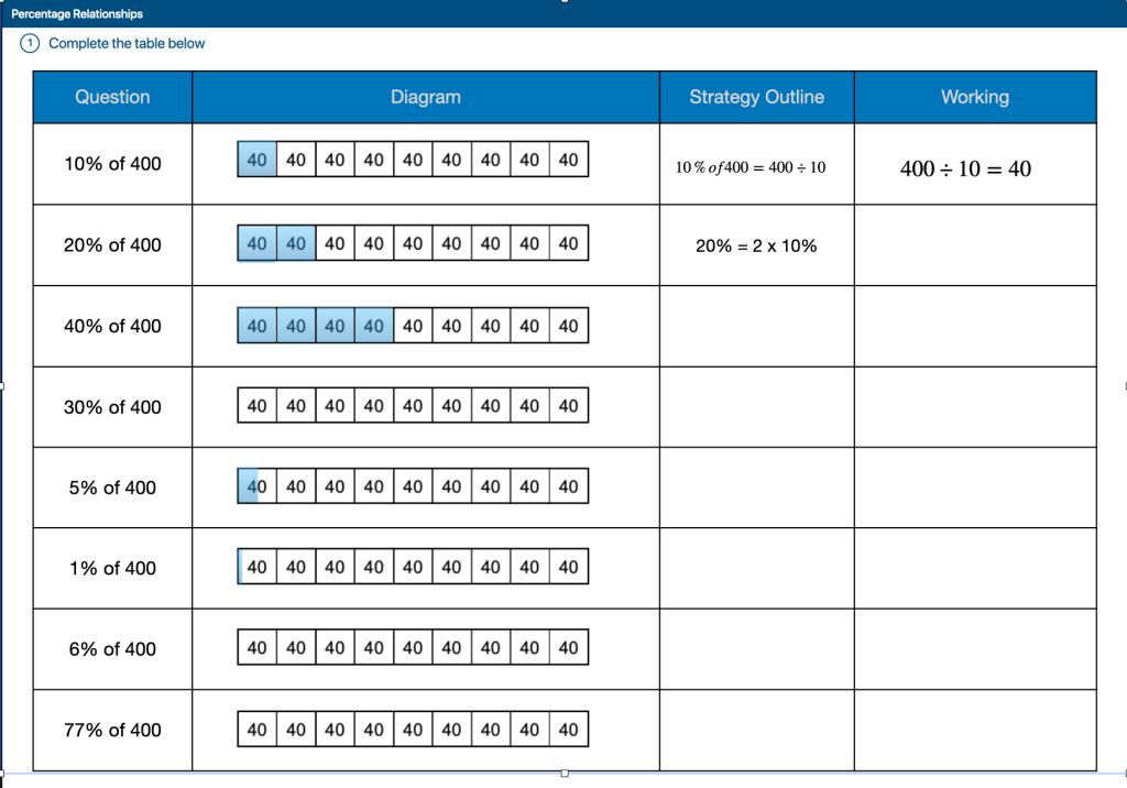 This task makes use of variation theory to help pupils to see how to ‘build’ different percentage calculations. It intends to show that by using percentages we already know we can ‘step’ forward onto another percentage.