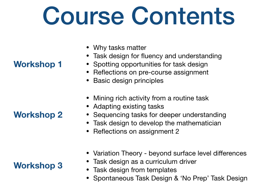 October 14, 2022October 14, 2022 Chris McGrane Task Design For a limited time only my 3 hour online course on task design is now only £10. Click the link below for more information. Designing Mathematical Tasks: A Practical Course Share this:Tweet Click to share on WhatsApp (Opens in new window) WhatsApp Click to email a link to a friend (Opens in new window) Email Click to print (Opens in new window) Print Like Loading... Related