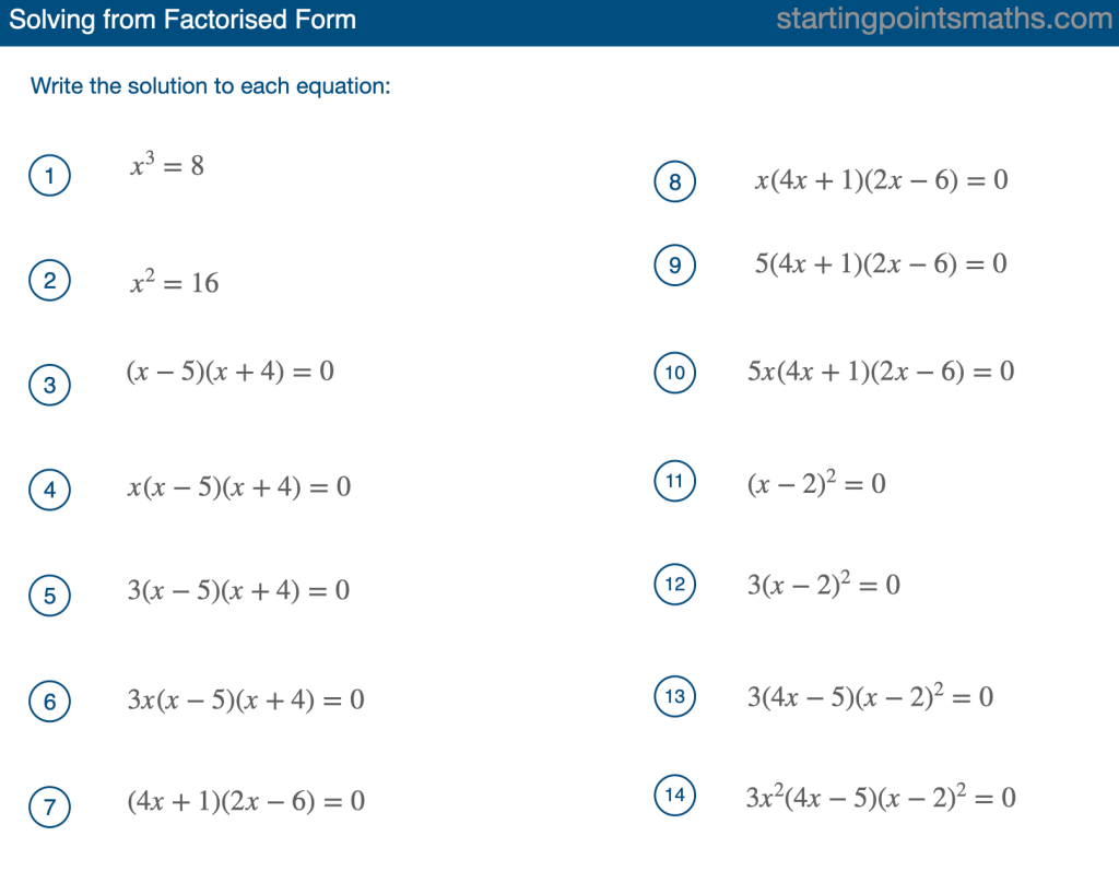 I’ve included x^2 = 16, as most pupils don’t factorise to a difference of 2 squares. Instead they end up with something like this. I am checking they know to write the positive and negative solution here. The rest of the task follows some regular variations that appear. 3 outside the brackets not being a solution, but 3x outside the bracket giving x = 0 as a solution etc.